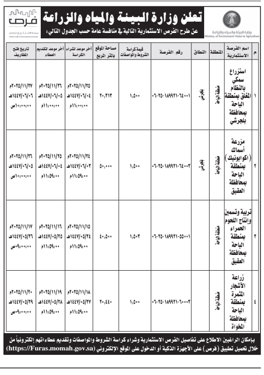 تعلن وزارة البيئة والمياه والزراعة عن
