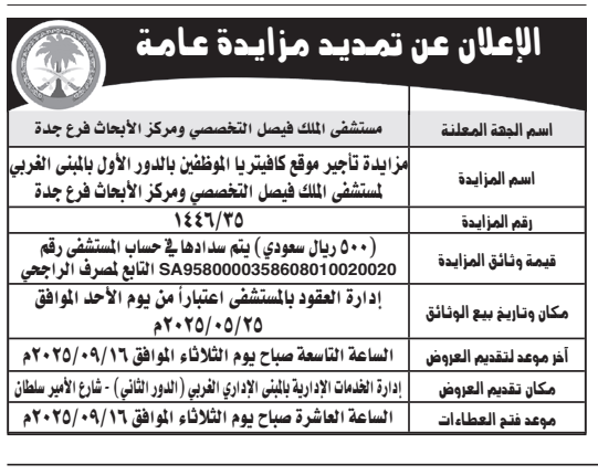 مزايدة- تأجير موقع كافيتريا الموظفين بالدور الأول بالمبنى الغربي بالمستشفى- مستشفى الملك فيصل التخصصي ومركز الأبحاث فرع جدة