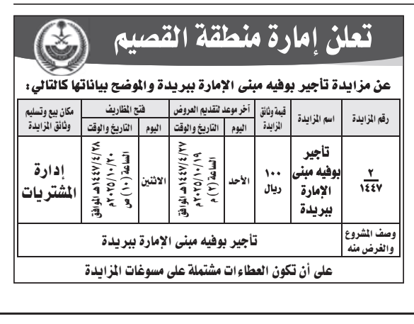 *مزايدة تأجير بوفيه مبنى الإمارة ببريدة والموضح بياناتها كالتالي
