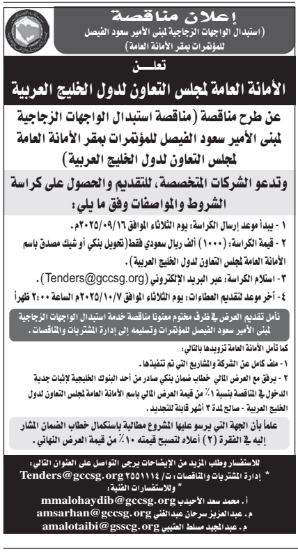مناقصة- استبدال الواجهات الزجاجية لمبنى الأمير سعود الفيصل للمؤتمرات- الأمانة العامة لمجلس التعاون لدول الخليج العربية