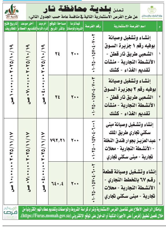 *طرح الفرص الاستثمارية التالية في منافسة عامة حسب الجدول التالي