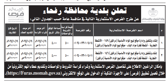 منافسة عامة- إنشاء وتشغيل وإدارة موقع لبيع المواد الأساسية- بلدية محافظة رفحاء