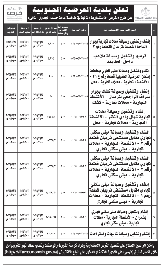 *طرح الفرص الاستثمارية التالية في منافسة عامة حسب الجدول التالي