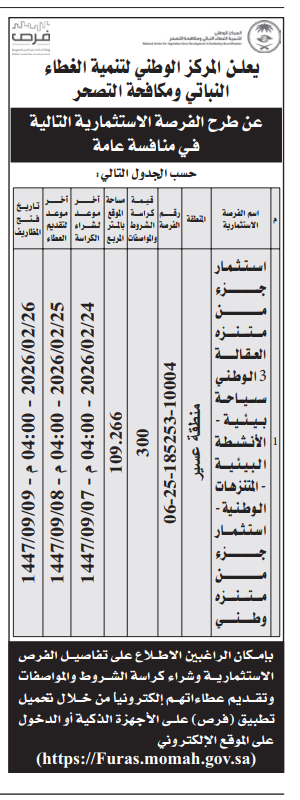 منافسة عامة- استثمار جزء من منتزه العقالة 3- المركز الوطني لتنمية الغطاء النباتي