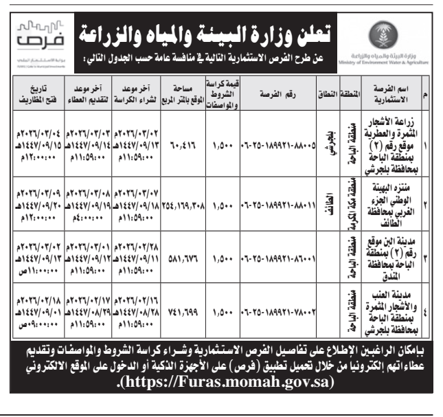 *طرح الفرص الاستثمارية التالية في منافسة عامة حسب الجدول التالي