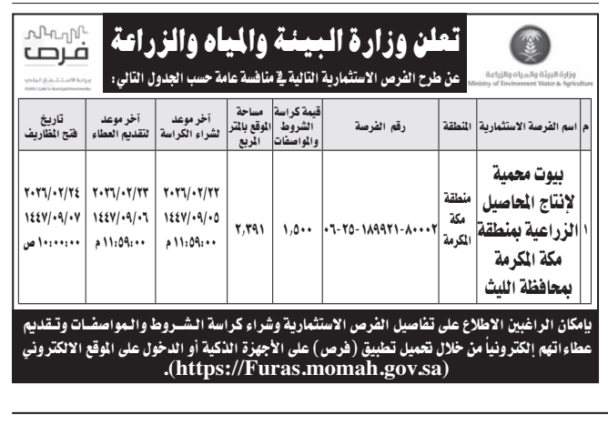 تعلن وزارة البيئة والمياه والزراعة عن