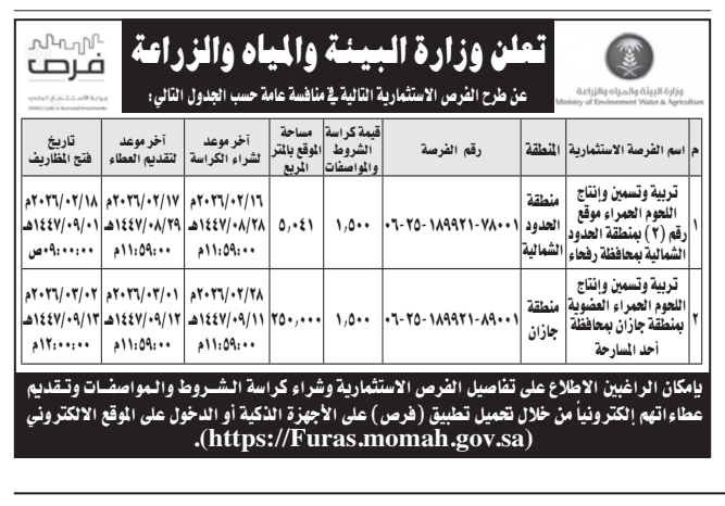 تعلن وزارة البيئة والمياه والزراعة عن
