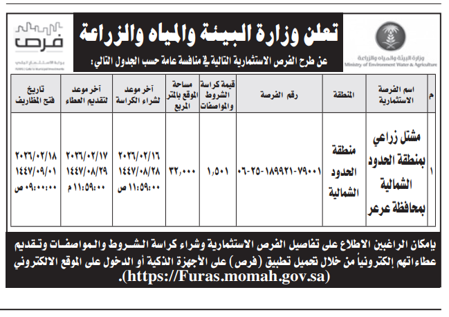 منافسة عامة- مشتل زراعي بمنطقة الحدود الشمالية بمحافظة عرعر- وزارة البيئة والمياه والزراعة