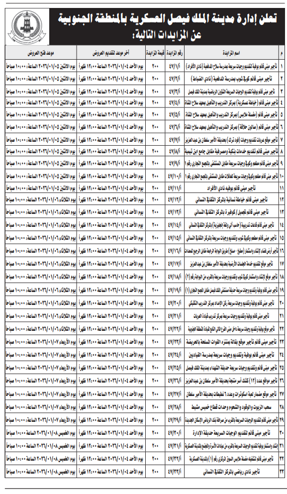مزايدة- تأجير مبنى قائم بوفيه لتقديم وجبات سريعة- إدارة مدينة الملك فيصل العسكرية
