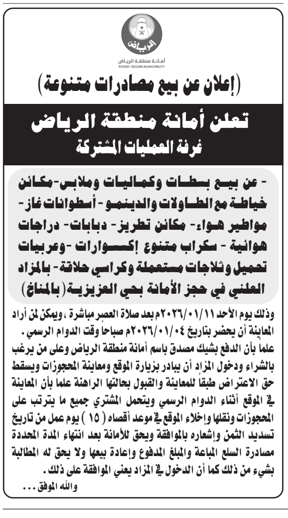 مزاد علني- بيع بسطات وكماليات وملابس- أمانة منطقة الرياض