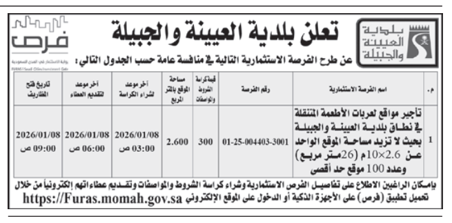 منافسة عامة- تأجير مواقع لعربات الأطعمة المتنقلة- بلدية العيينة والجبيلة