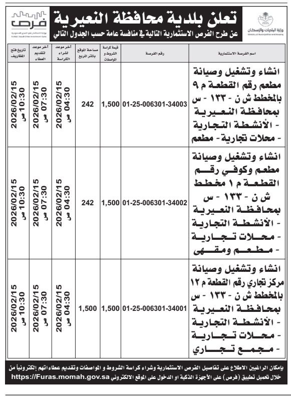 *طرح الفرص الاستثمارية التالية في منافسة عامة حسب الجدول التالي