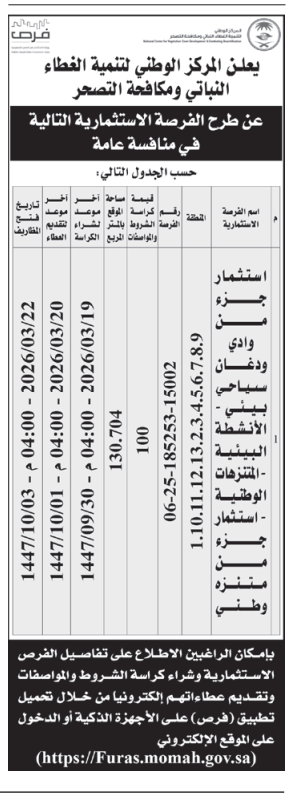 منافسة عامة- استثمار جزء من وادي ودغان سياحي بيئي- المركز الوطني لتنمية الغطاء النباتي ومكافحة التصحر