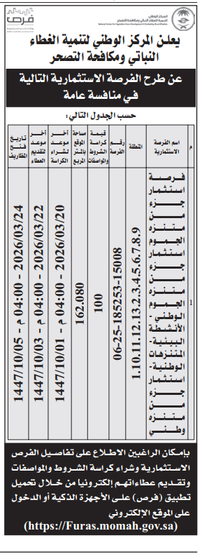 *طرح الفرصة الاستثمارية التالية في منافسة عامة حسب الجدول التالي